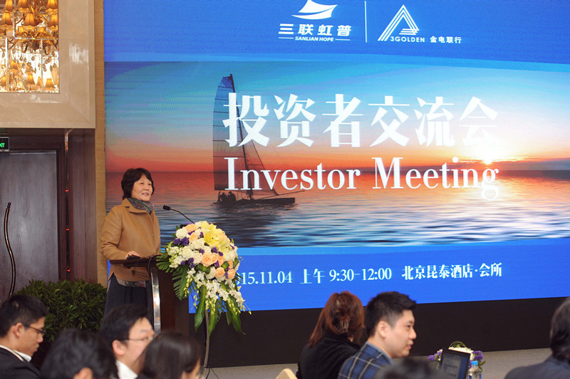 2015年11月4日,三聯(lián)虹普協(xié)同金電聯(lián)行于北京昆泰酒店成功舉辦了一場(chǎng)“投資者交流會(huì)”,三聯(lián)虹普董事長(zhǎng)/總經(jīng)理劉迪女士、副總經(jīng)理李德和先生、董事會(huì)秘書(shū)/ 副總經(jīng)理韓梅女士、三聯(lián)金電董事長(zhǎng)張敏喆先生、金電聯(lián)行董事長(zhǎng)范曉忻先生、首席科學(xué)家朱志偉先生、董事會(huì)秘書(shū)白雪松先生、三聯(lián)金電總經(jīng)理王懿女士,出席了會(huì)議并與投資者交流,100多名基金、證券公司代表參加了會(huì)議。會(huì)議議程主要包括:三聯(lián)虹普經(jīng)營(yíng)情況及發(fā)展戰(zhàn)略演講、金電聯(lián)行業(yè)務(wù)介紹演講、一站式征信業(yè)務(wù)發(fā)布及發(fā)展前景演講、投資者問(wèn)答環(huán)節(jié)等。